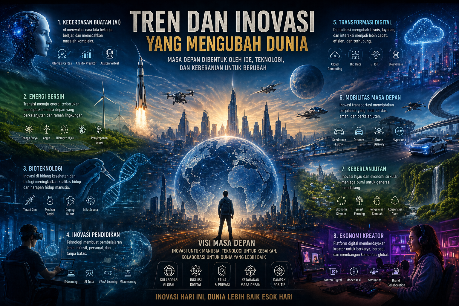 Tren dan inovasi yang berkembang saat ini telah mengubah dunia secara fundamental. Dari kecerdasan buatan, ekonomi digital, hingga energi berkelanjutan, semua inovasi ini membentuk masa depan yang lebih terhubung, efisien, dan kompleks.
